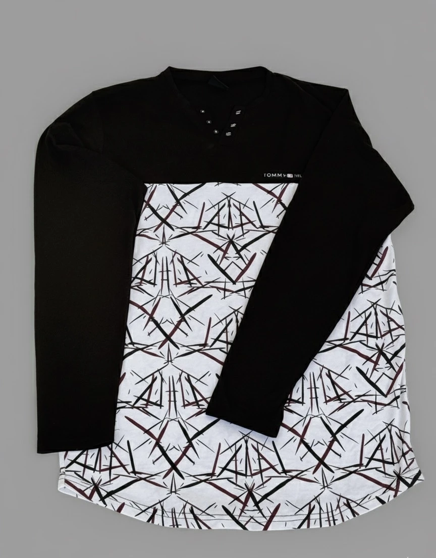 Stylish Design: A bold contrast of solid black sleeves and upper chest paired with a dynamic white patterned body featuring abstract line graphics in maroon and black.