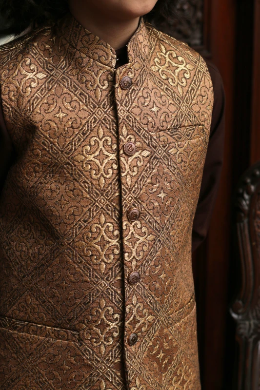 OFF WHITE/GOLDEN EMBROIDERY JAMAWAR KID'S WAIST COAT