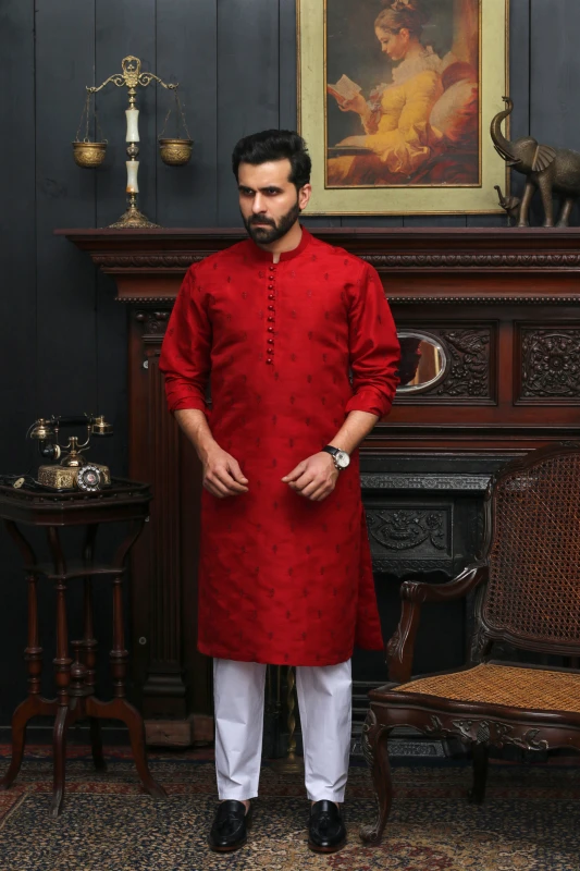 RED EMBROIDED MEN'S COTTON KURTA