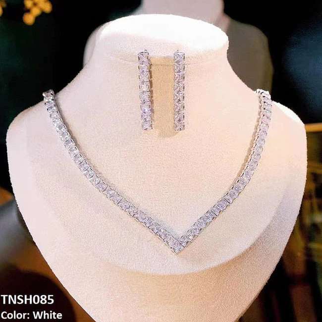 Keyword Highlights: V-shaped zircon necklace, zircon earrings, zinc alloy jewelry, silver rhodium plated, elegant jewelry set.