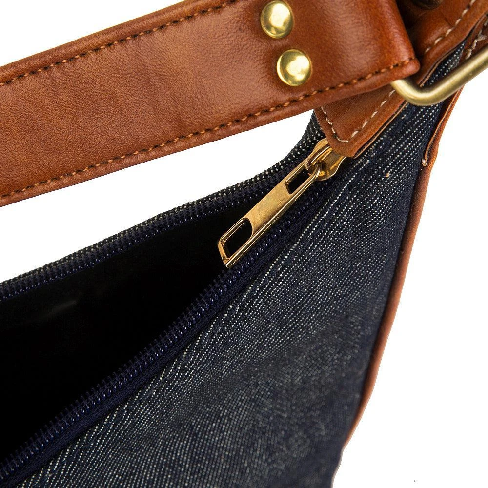 Experience stylish functionality with this denim-print PU leather shoulder bag.