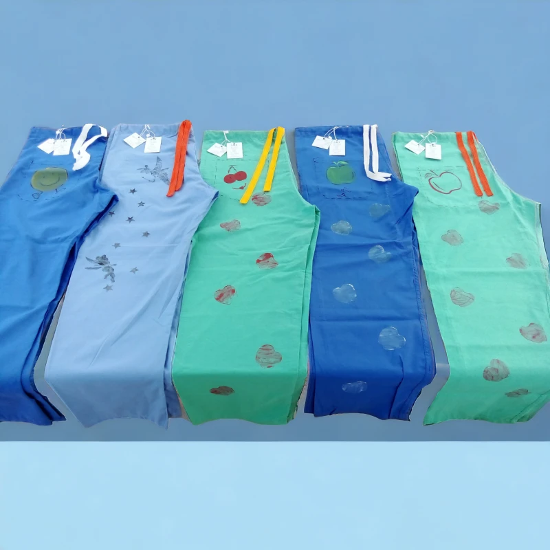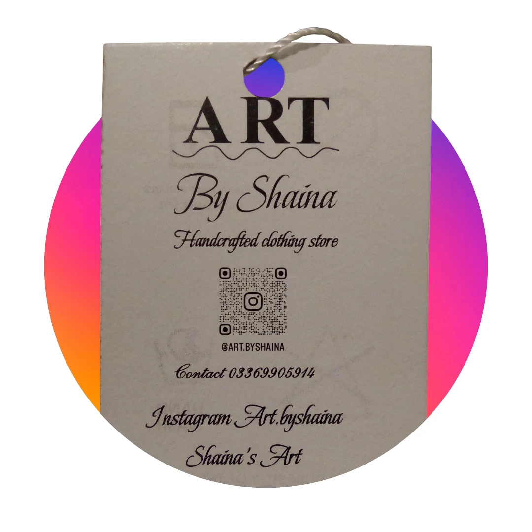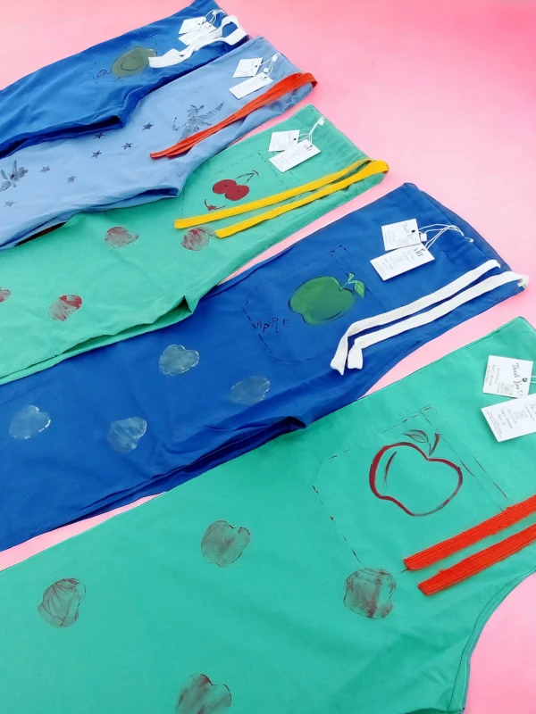 Elevate your casual wear with Art by Shaina's exclusive handpainted trousers! These one-of-a-kind cotton trousers feature a delightful stamp design with butterflies, fairies, and fruit motifs.
