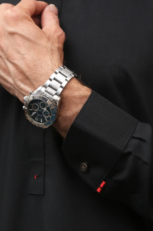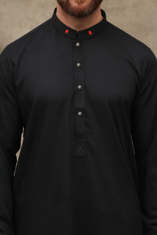 JET BLACK WASH & WEAR MEN'S SHALWAR KAMEEZ WITH RED CONT