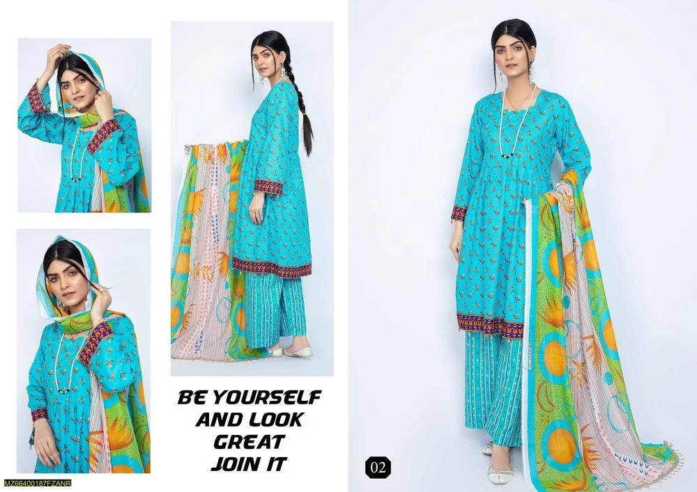 This three-piece printed lawn suit offers a stylish design, ideal for comfortable wear during the summer season.