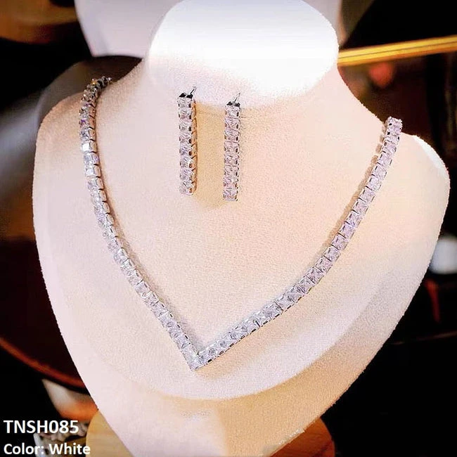 Keyword Highlights: V-shaped zircon necklace, zircon earrings, zinc alloy jewelry, silver rhodium plated, elegant jewelry set.